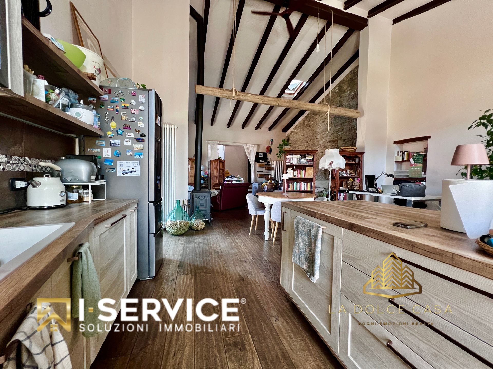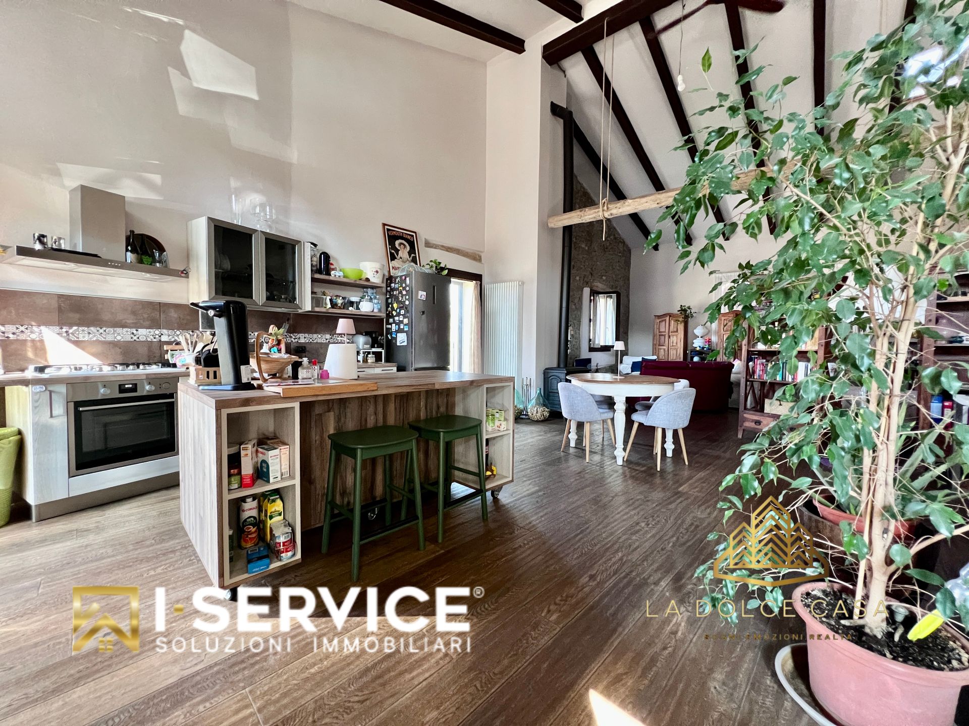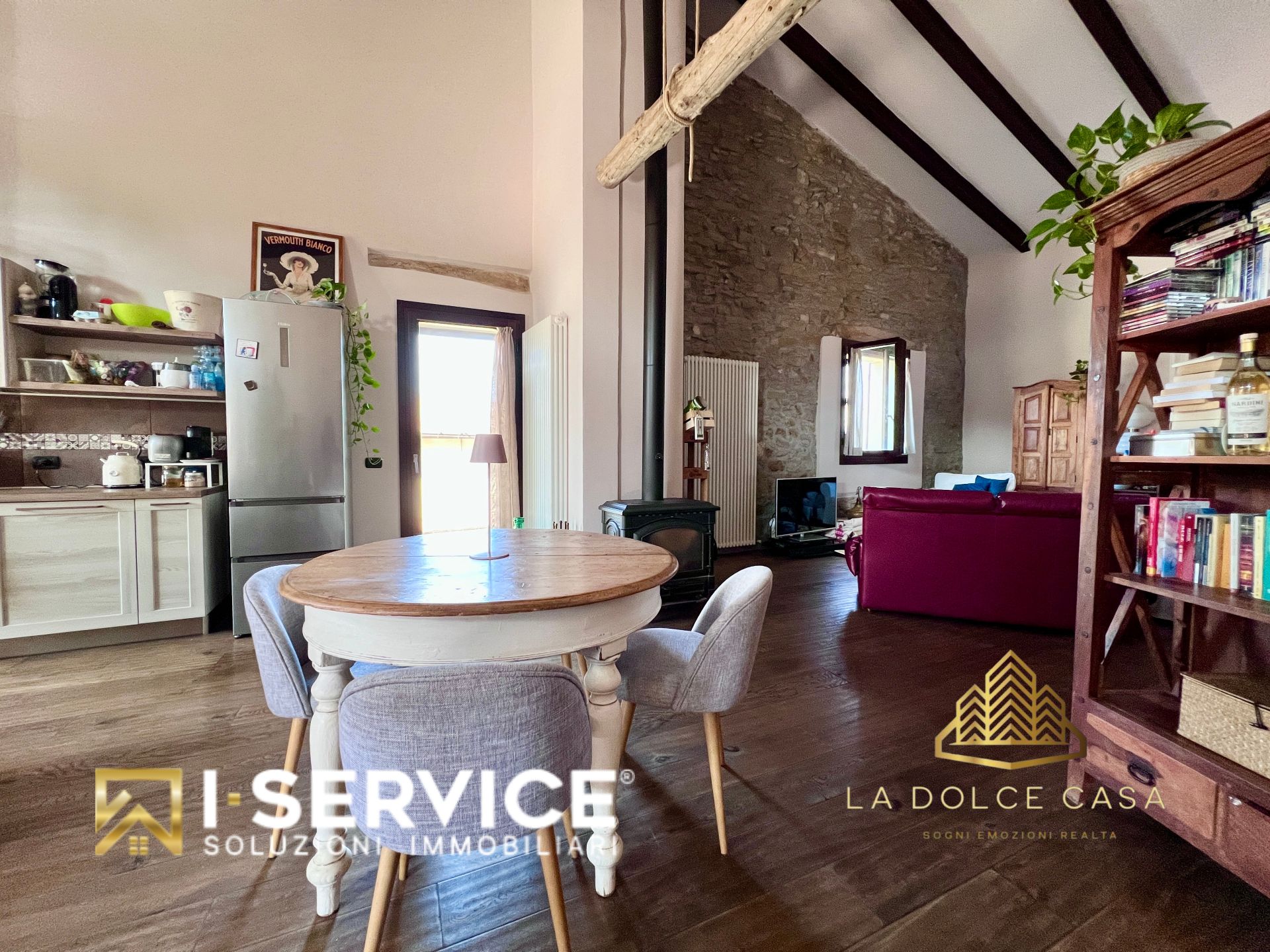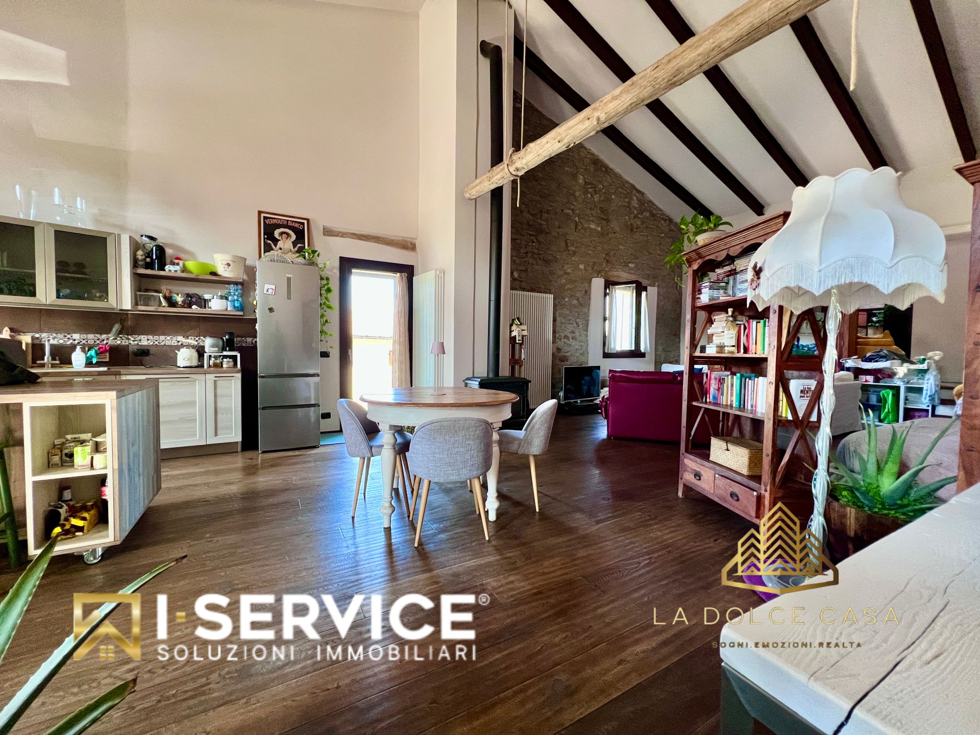 All’interno, il loft si distingue per i suoi spazi aperti e caldi, valorizzati da travi a vista, pareti in pietra naturale e un parquet rustico in rovere color noce che dona eleganza e naturalezza. La cucina su misura con isola, il grande salone con stufa a legna e il bagno con doccia e vasca idromassaggio sono stati progettati per vivere la casa in pieno comfort e libertà.