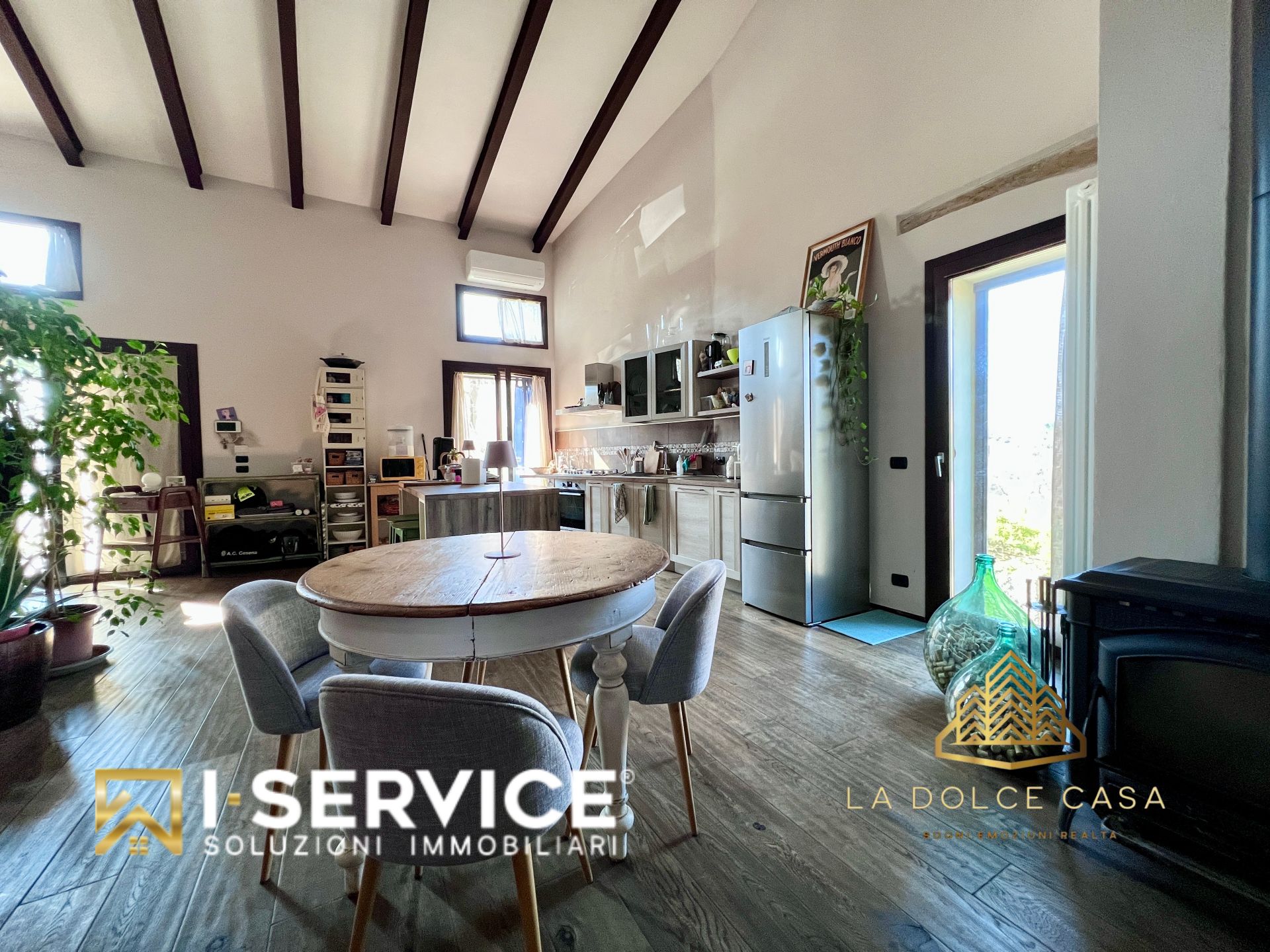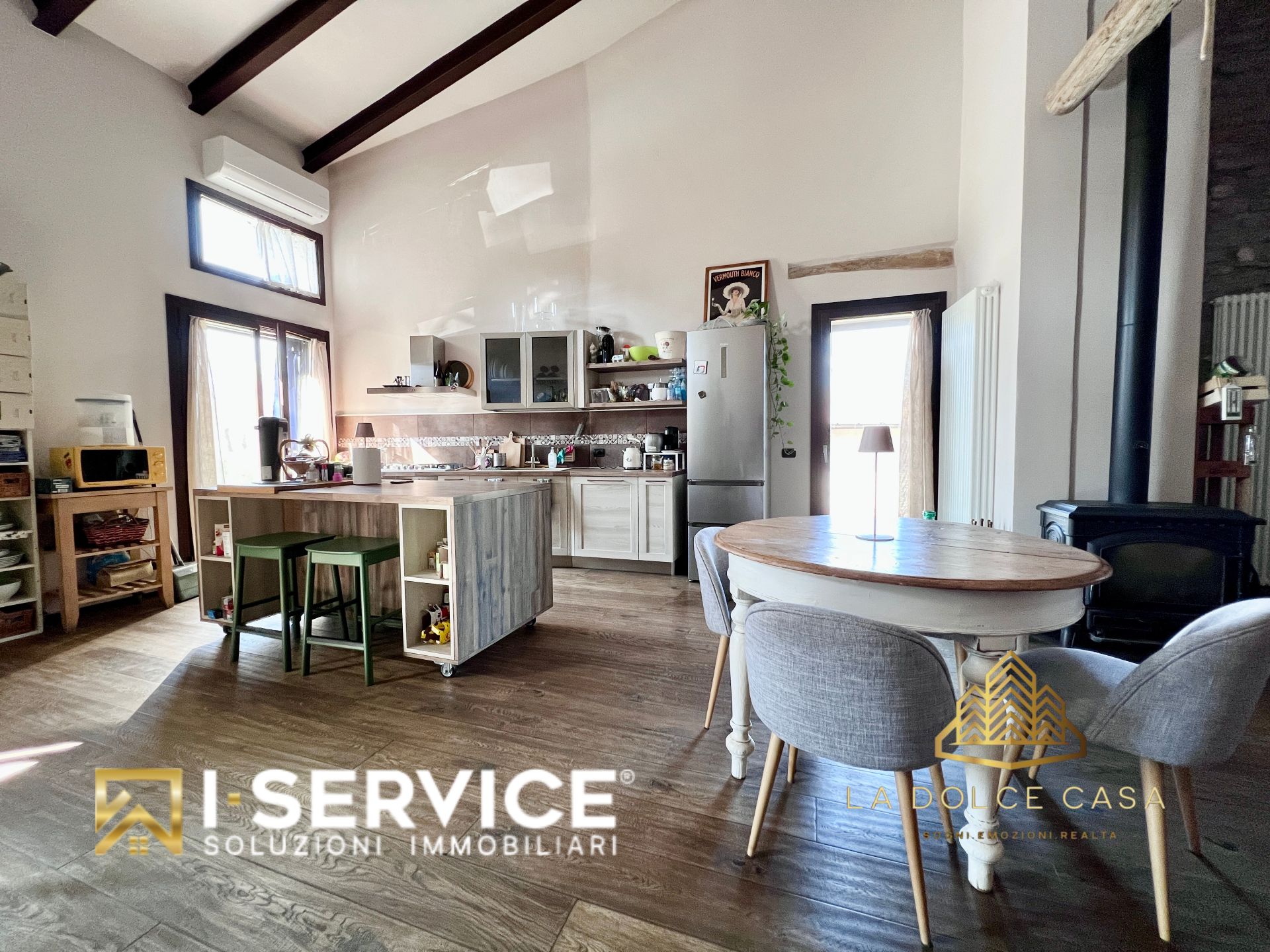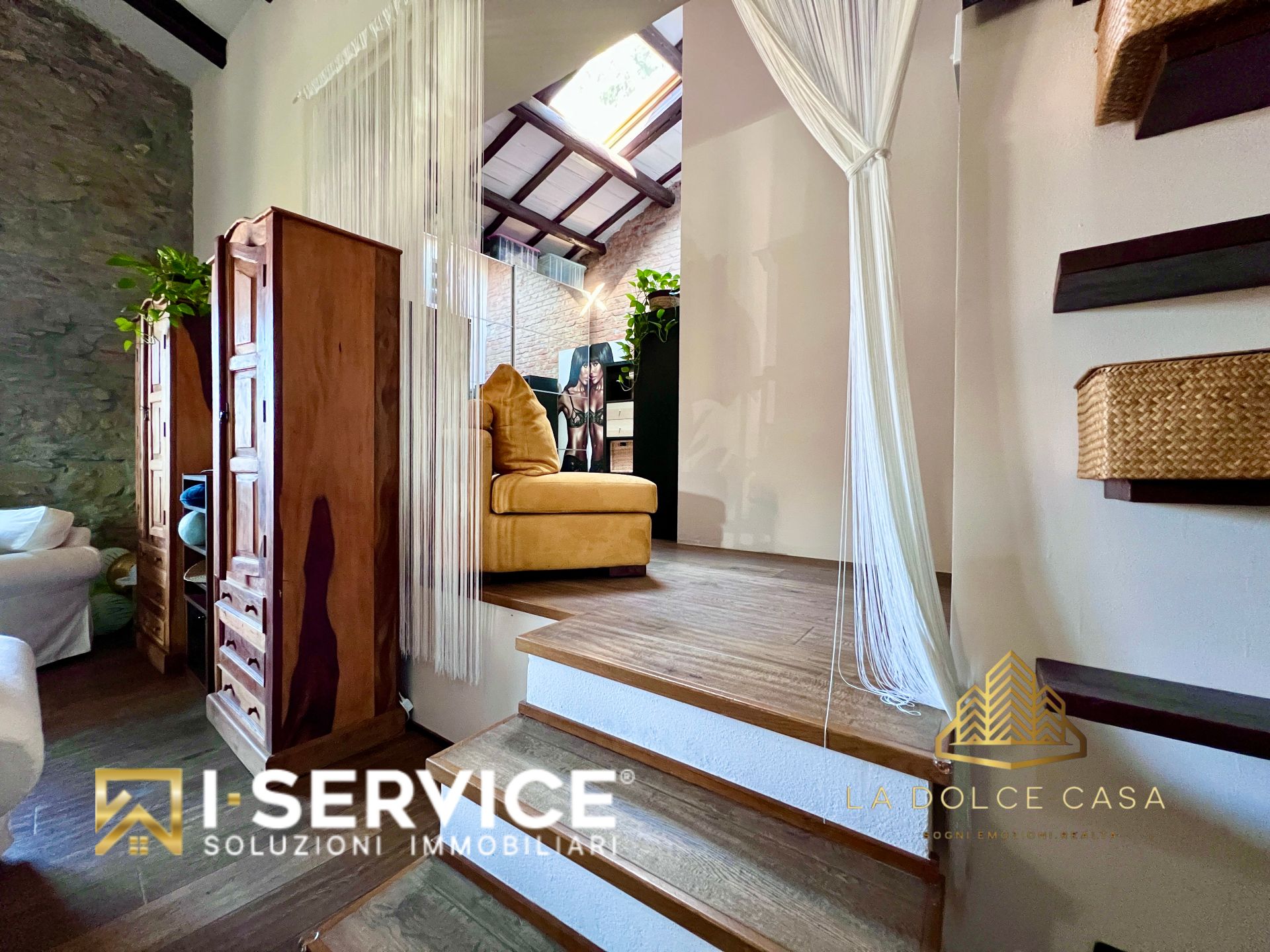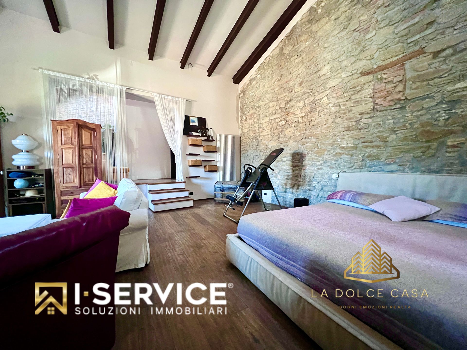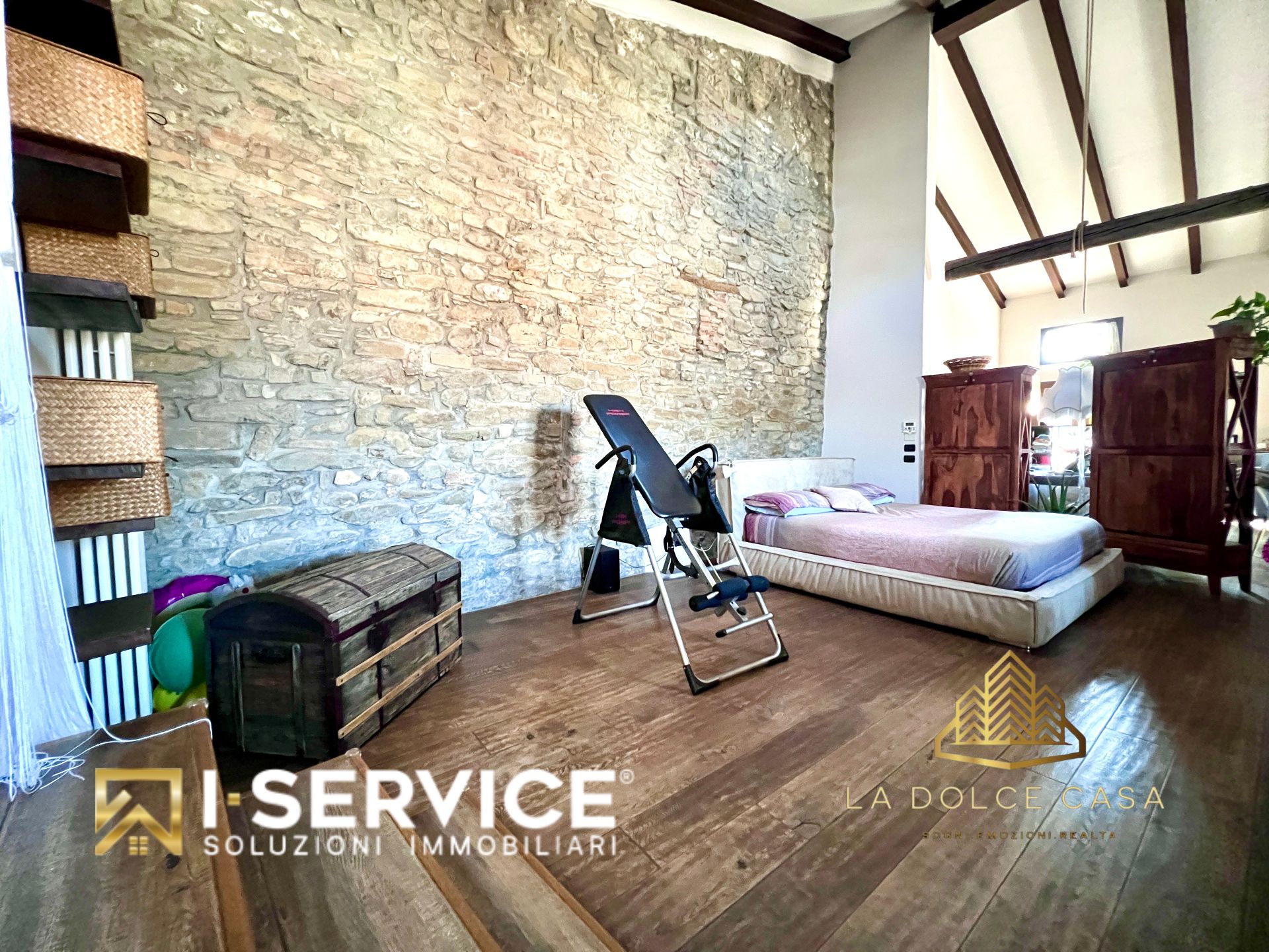 All’interno, il loft si distingue per i suoi spazi aperti e caldi, valorizzati da travi a vista, pareti in pietra naturale e un parquet rustico in rovere color noce che dona eleganza e naturalezza. La cucina su misura con isola, il grande salone con stufa a legna e il bagno con doccia e vasca idromassaggio sono stati progettati per vivere la casa in pieno comfort e libertà.