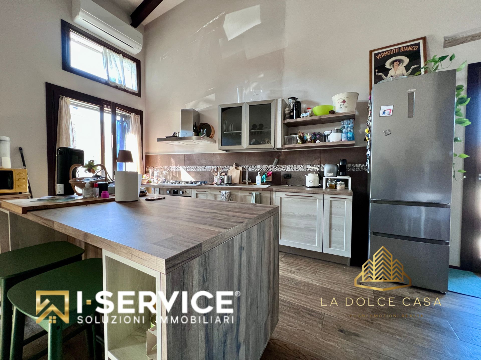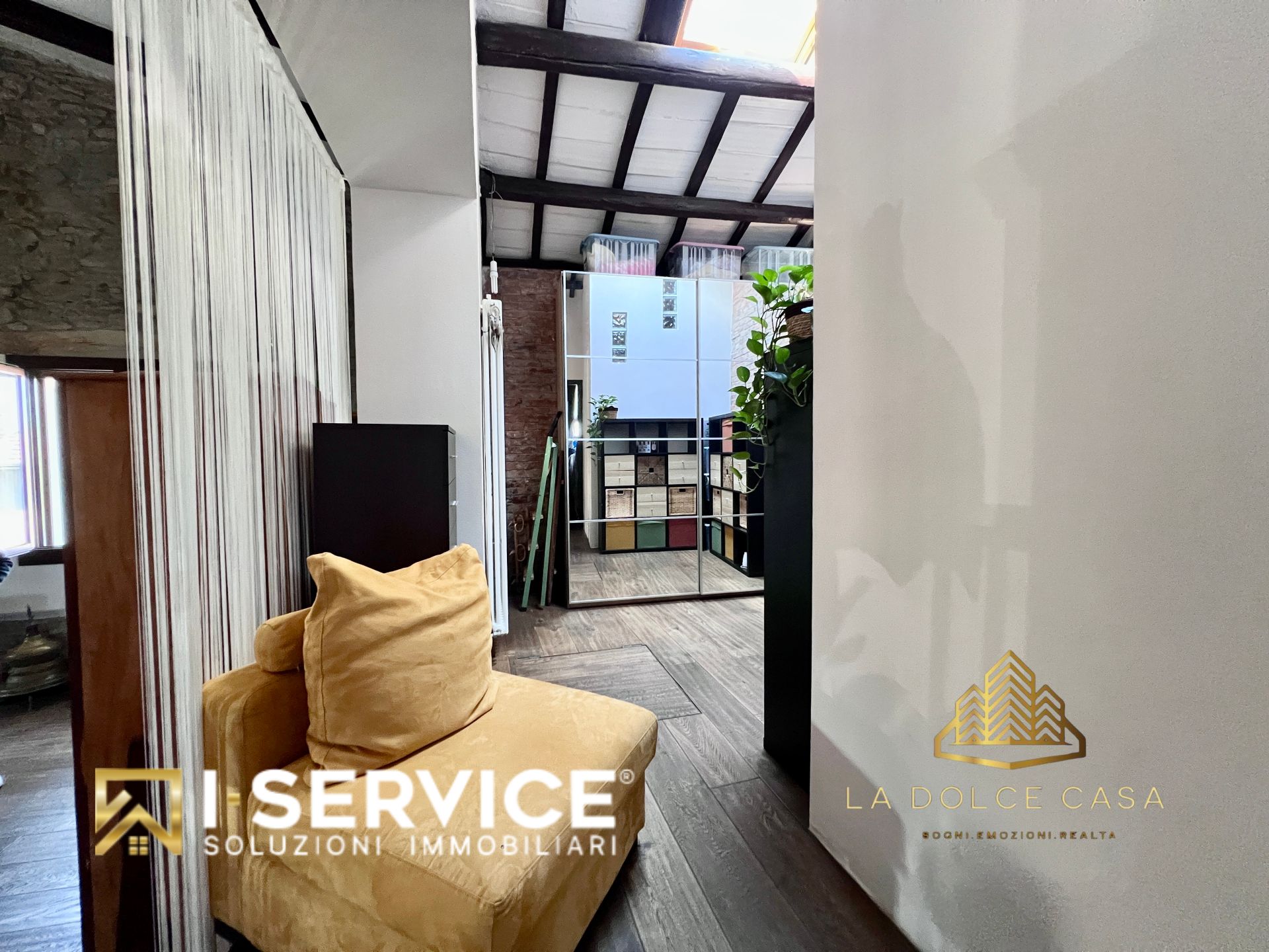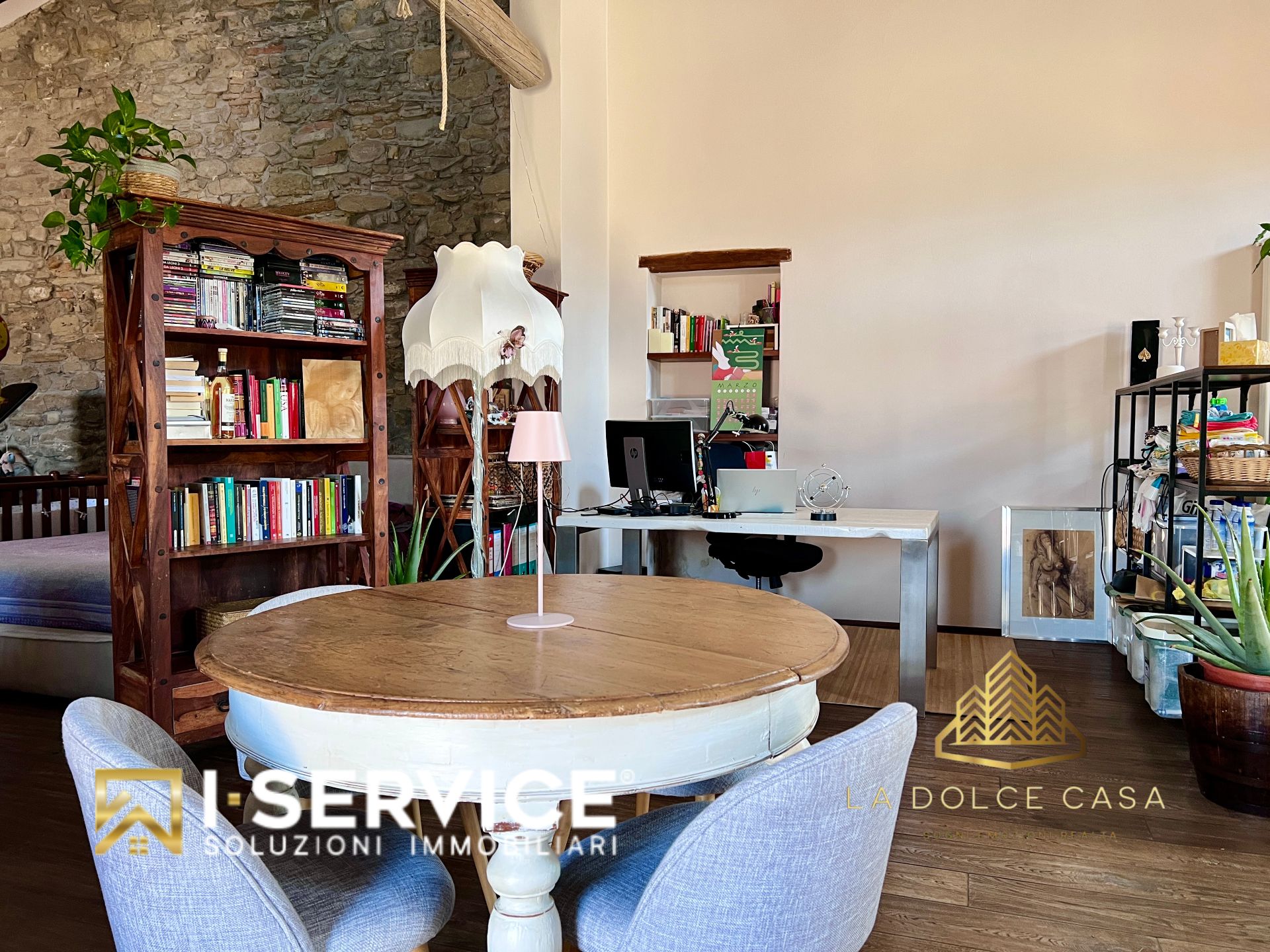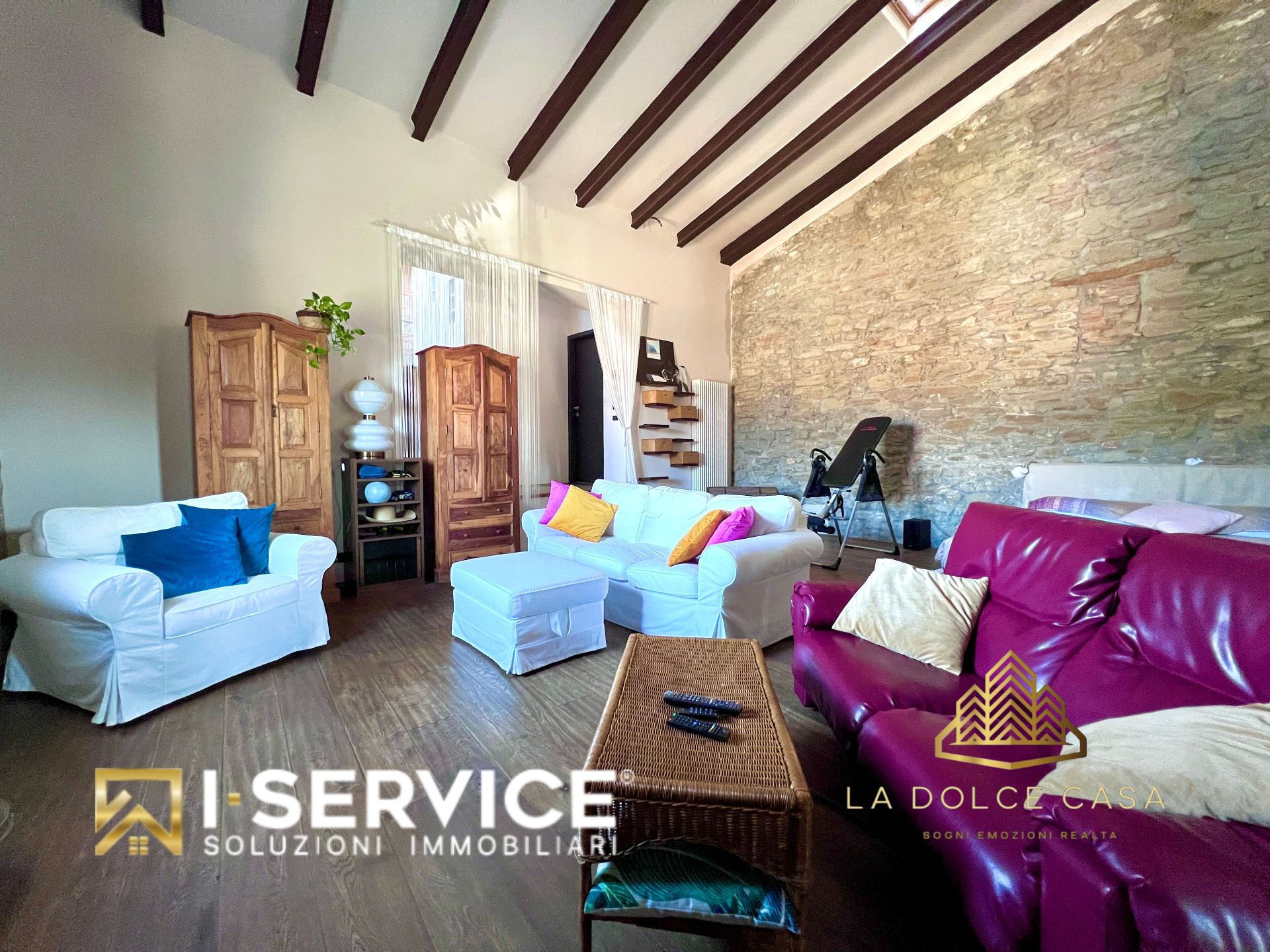 All’interno, il loft si distingue per i suoi spazi aperti e caldi, valorizzati da travi a vista, pareti in pietra naturale e un parquet rustico in rovere color noce che dona eleganza e naturalezza. La cucina su misura con isola, il grande salone con stufa a legna e il bagno con doccia e vasca idromassaggio sono stati progettati per vivere la casa in pieno comfort e libertà.