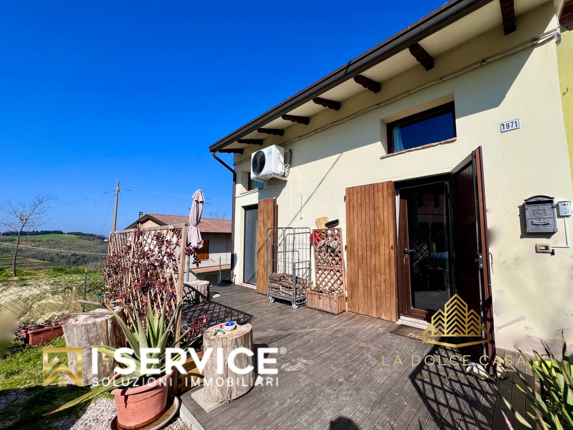 All’esterno, il decking in larice invita a godere della quiete delle colline e delle serate estive, mentre la corte esclusiva offre spazio e privacy, con la possibilità di posteggiare comodamente due auto o moto.